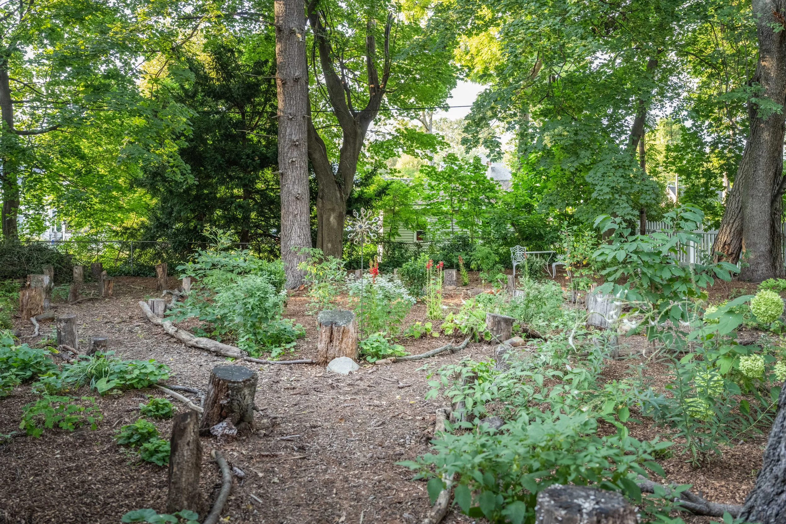 Last year, Red Oak Permaculture began replanting the area with a mix of native woodland plants, adding more this year to fill in and strengthen the habitat. The winding mulch path is shaded by mulberry, sassafras, and pine, and lined with plants that support pollinators and wildlife. Among them are pawpaw saplings, native berry bushes like chokeberry, elderberry, and raspberry, and common milkweed for monarchs. In the far corner, a compost area recycles all of our yard clippings, branches, and weeds back into rich soil for the garden.